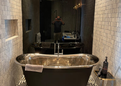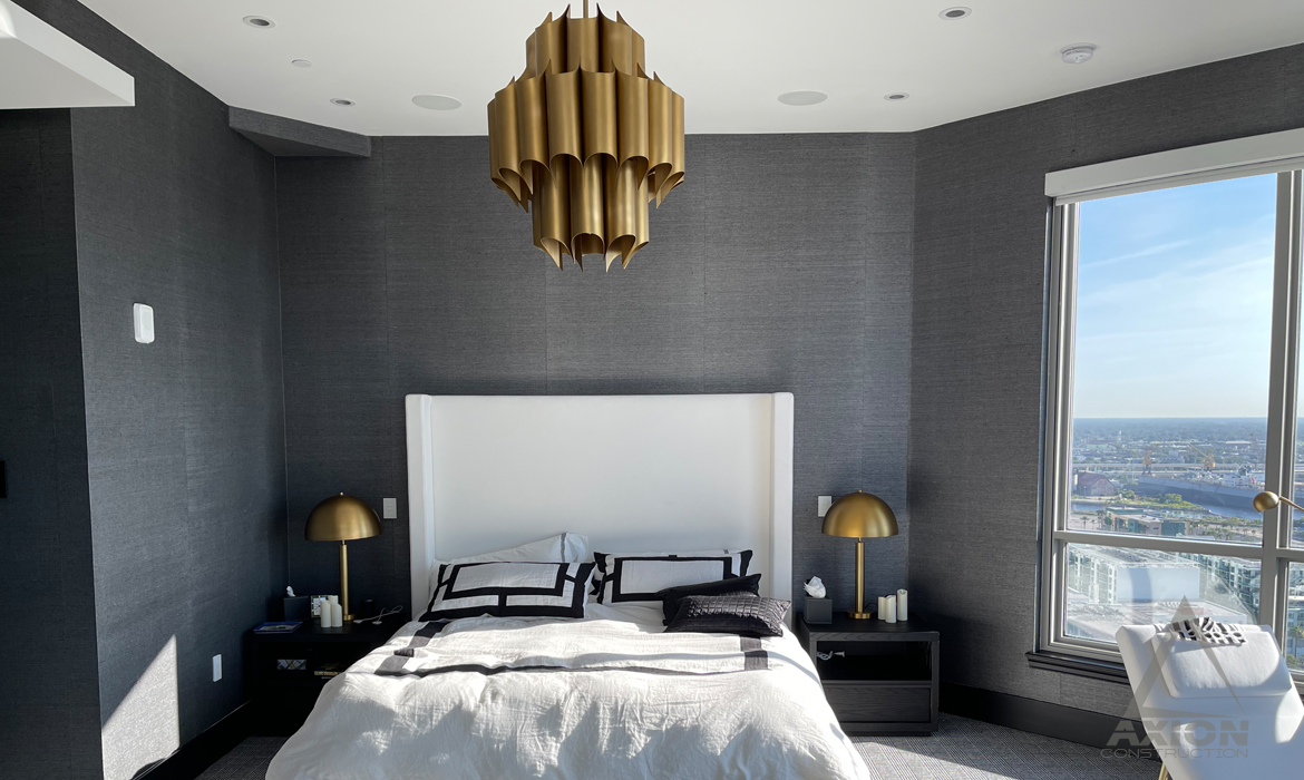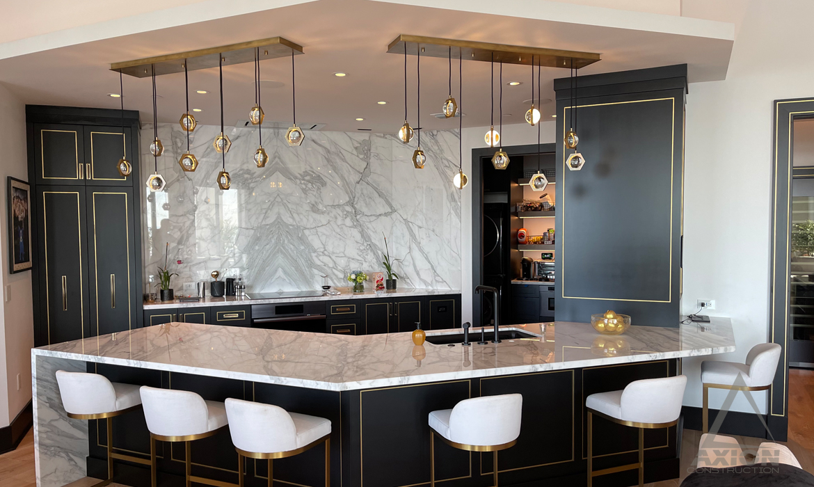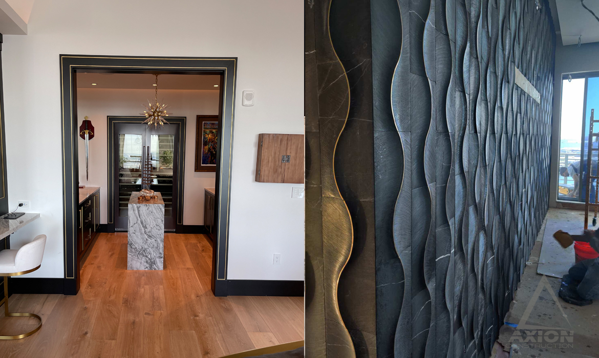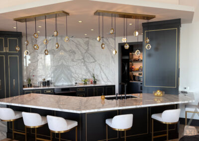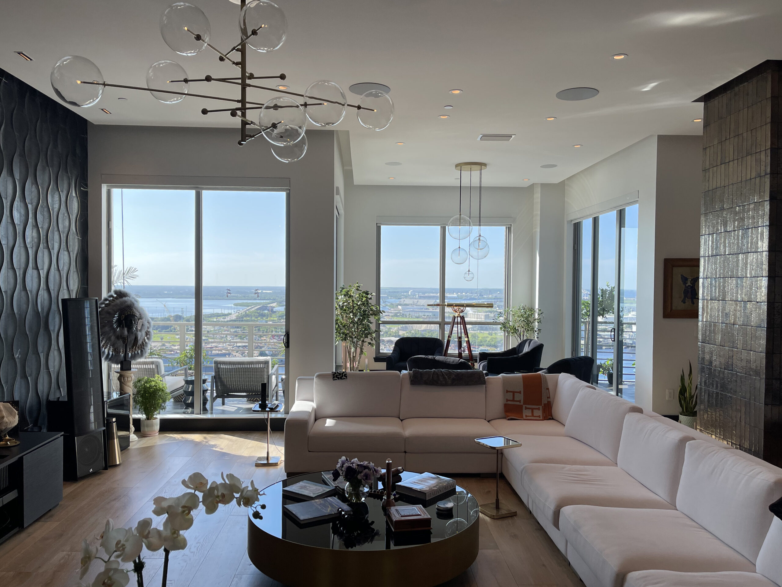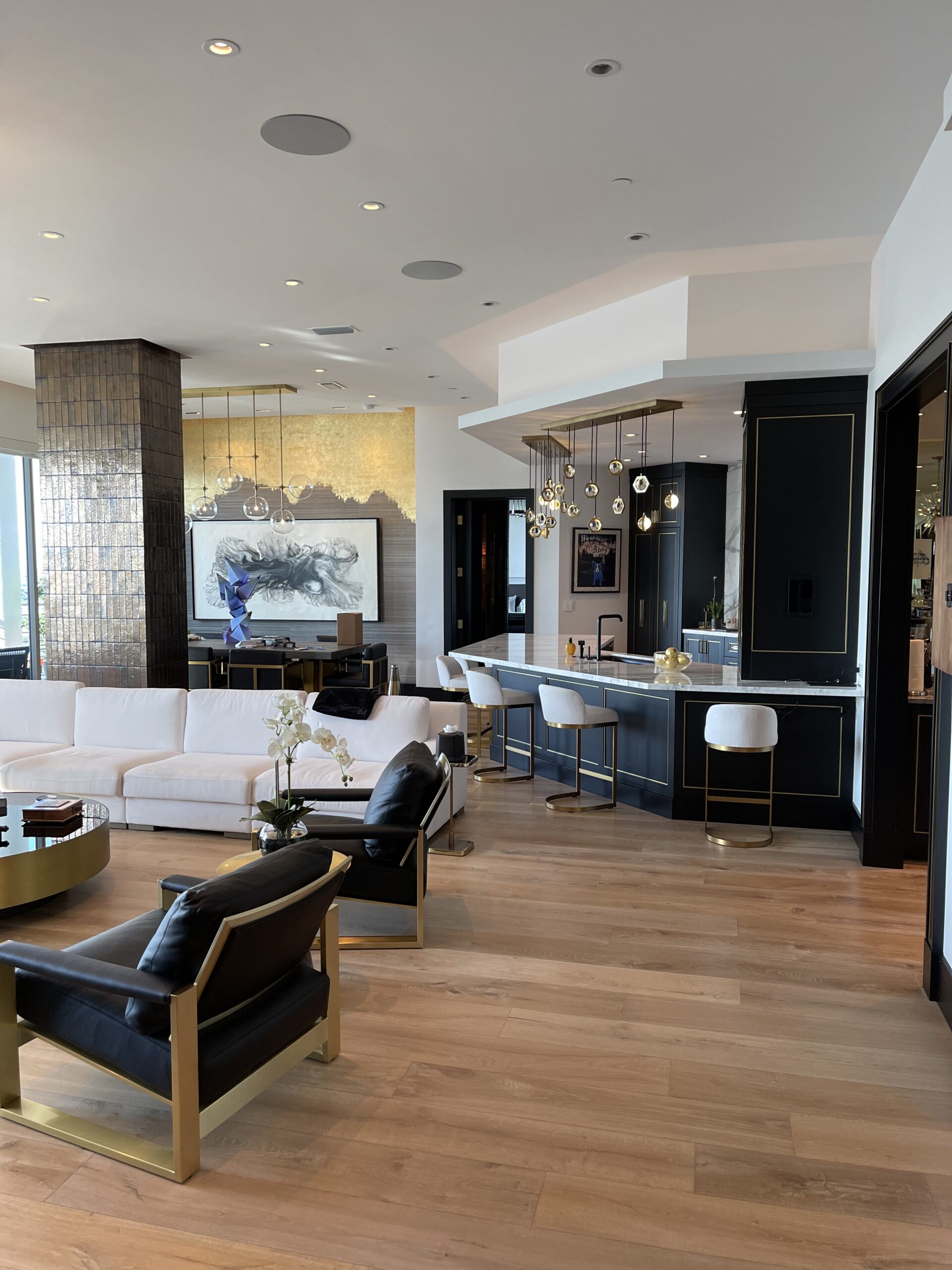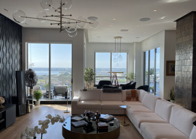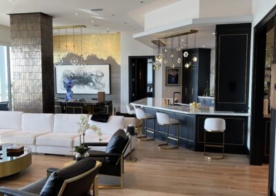 Located in the Channelside district of Tampa, Florida. The client wanted special unique features everywhere; a full custom kitchen with book matched stone backsplash, black tile with brass inlays on the feature wall, and spectacular bathrooms. This build also had a halo design in the ceiling with lighting to make the appearance that the ceiling was floating.
