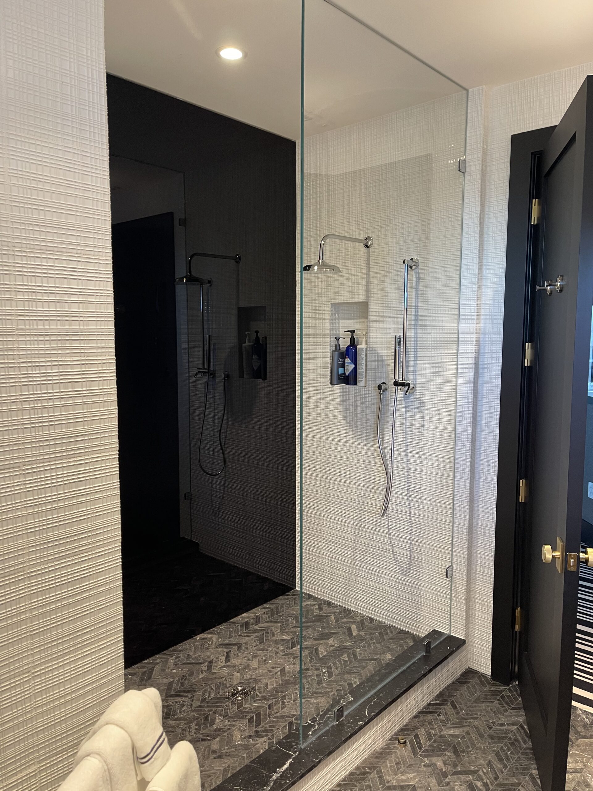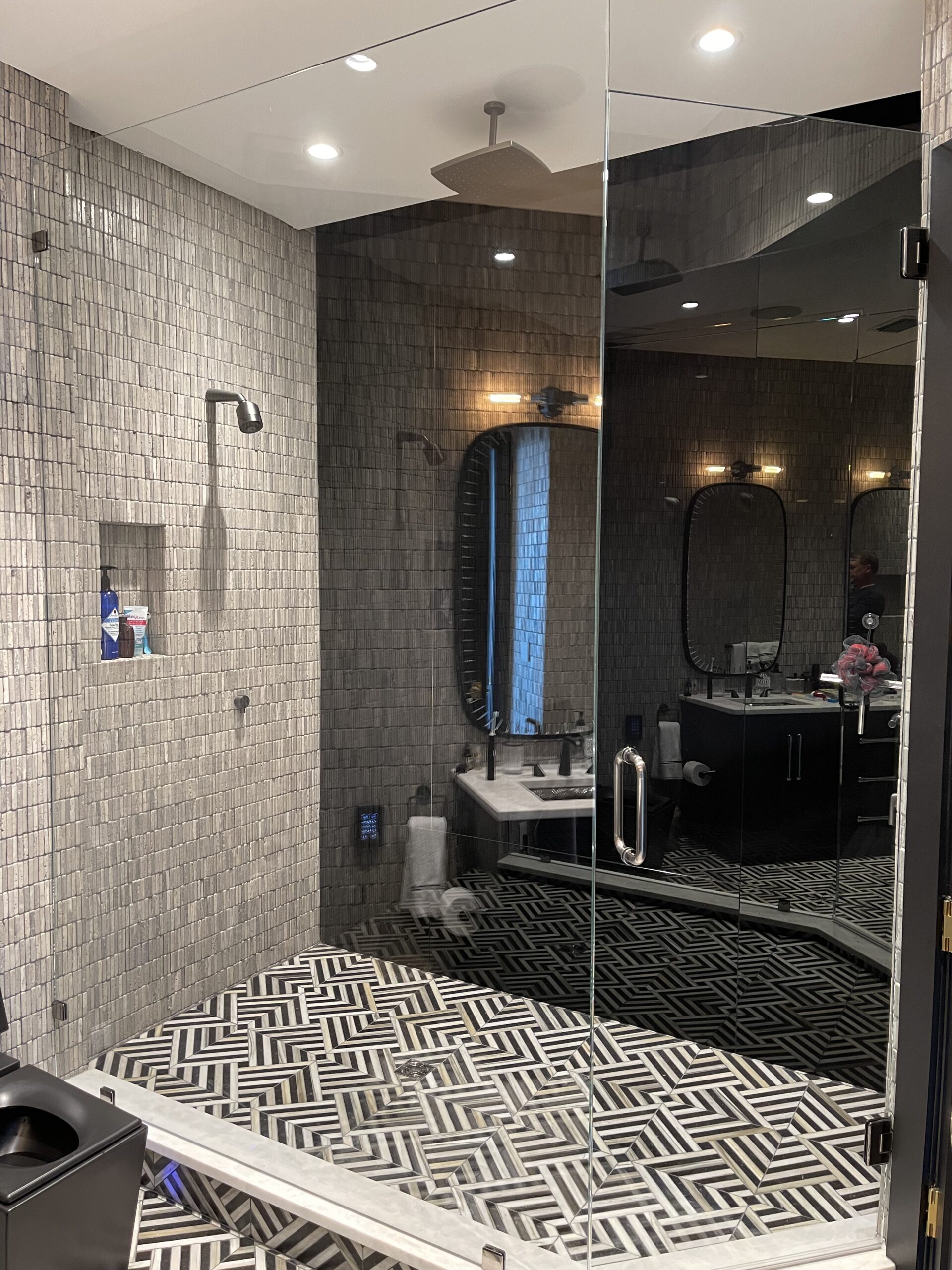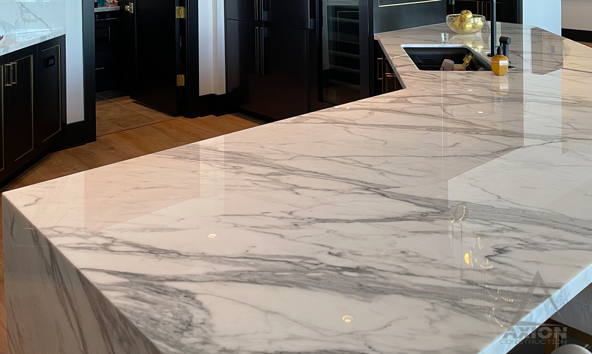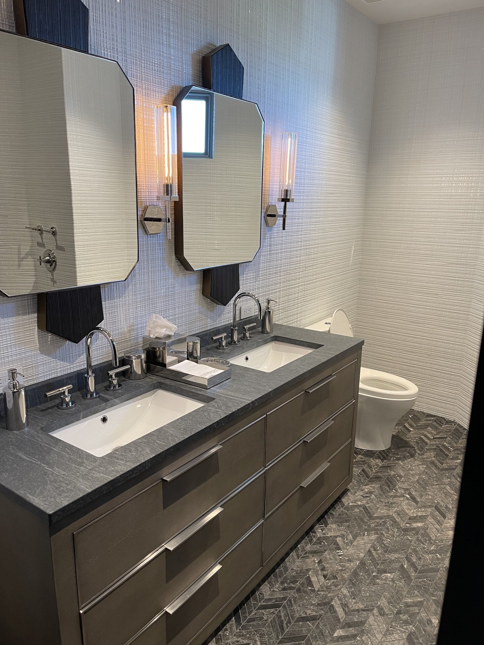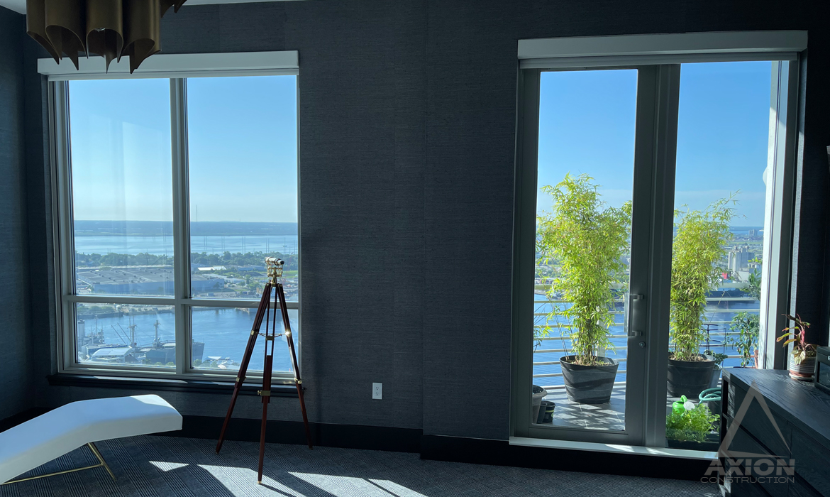 Located in the Channelside district of Tampa, Florida. The client wanted special unique features everywhere; a full custom kitchen with book matched stone backsplash, black tile with brass inlays on the feature wall, and spectacular bathrooms. This build also had a halo design in the ceiling with lighting to make the appearance that the ceiling was floating.
